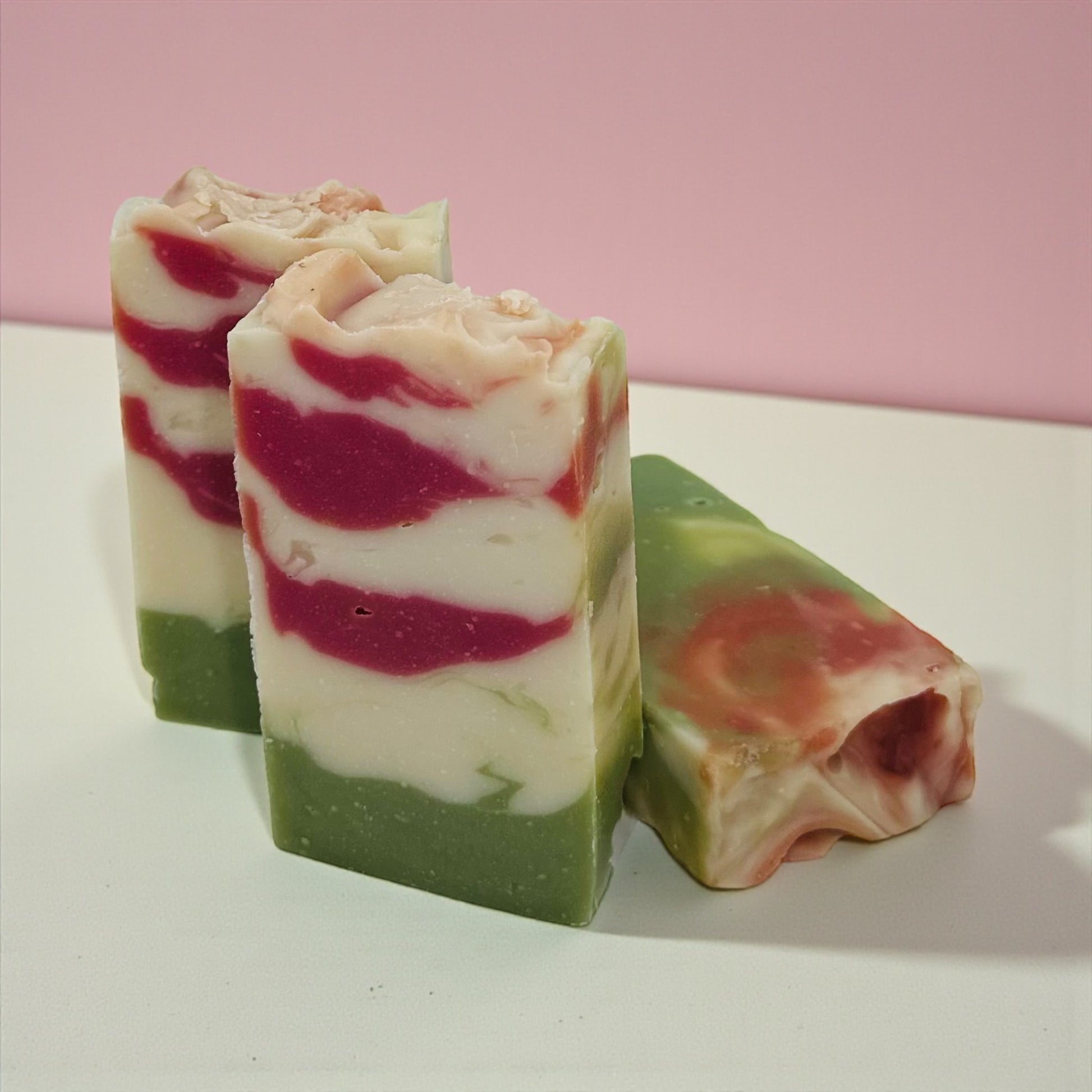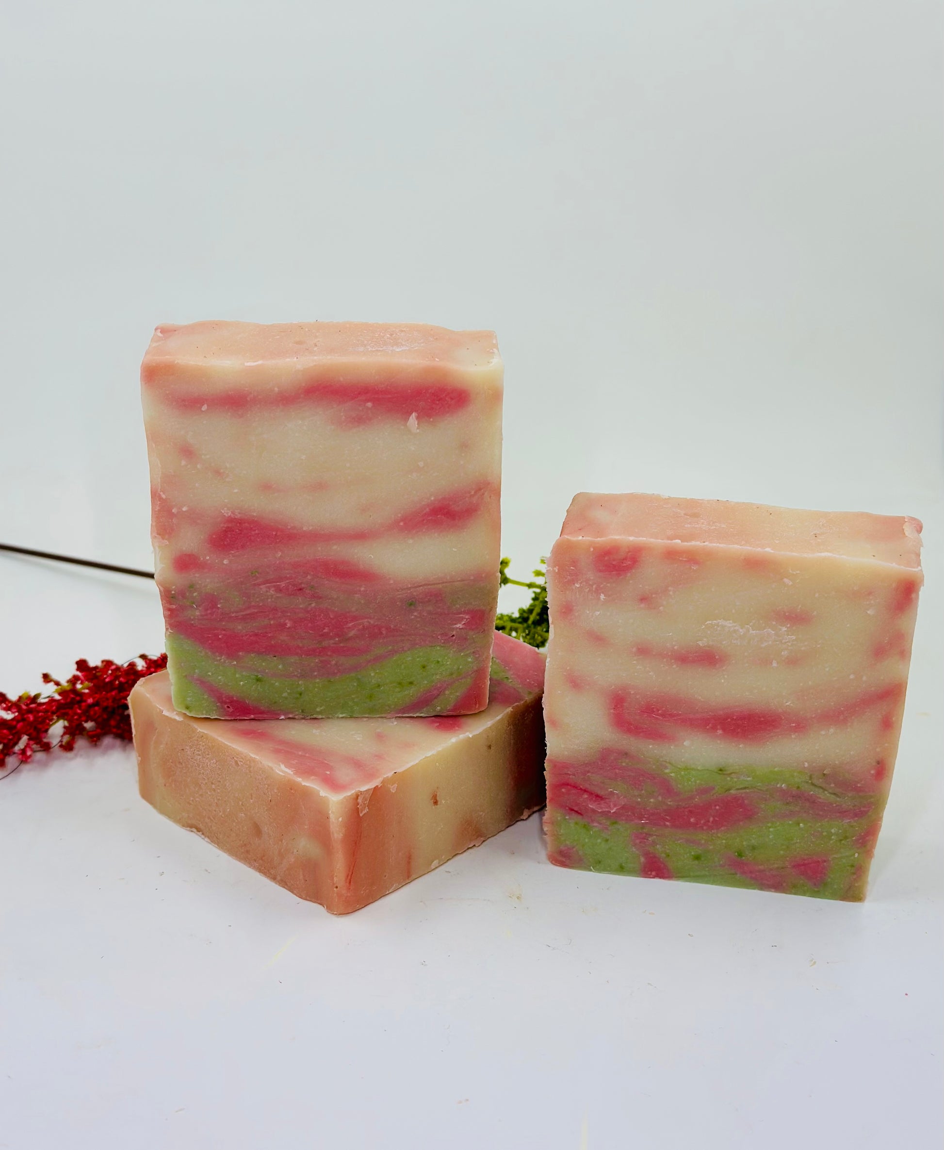 Made Coconut oil, Palm oil, Olive oil, Shea Butter, Rice Bran oil, Cocoa Butter, Vit. E., Kaolin Clay, NAOH, sodium lactate, colorant, essential oils and fragrances.