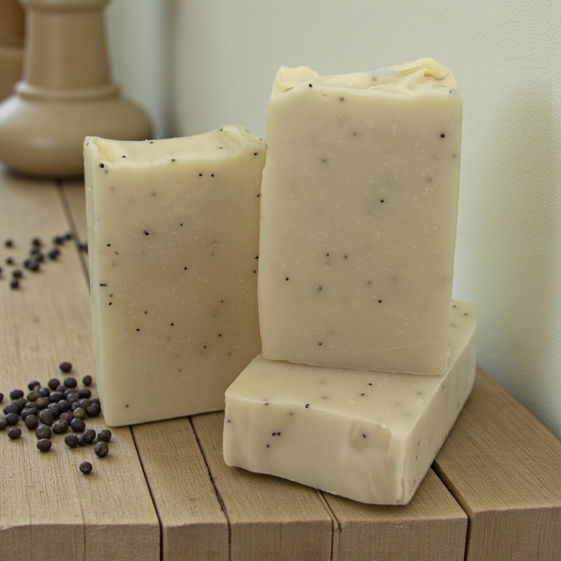 Made Coconut oil, Palm oil, Olive oil, Shea Butter, Rice Bran oil, Cocoa Butter, Vit. E., Kaolin Clay, NAOH, sodium lactate, colorant, essential oils and fragrances.