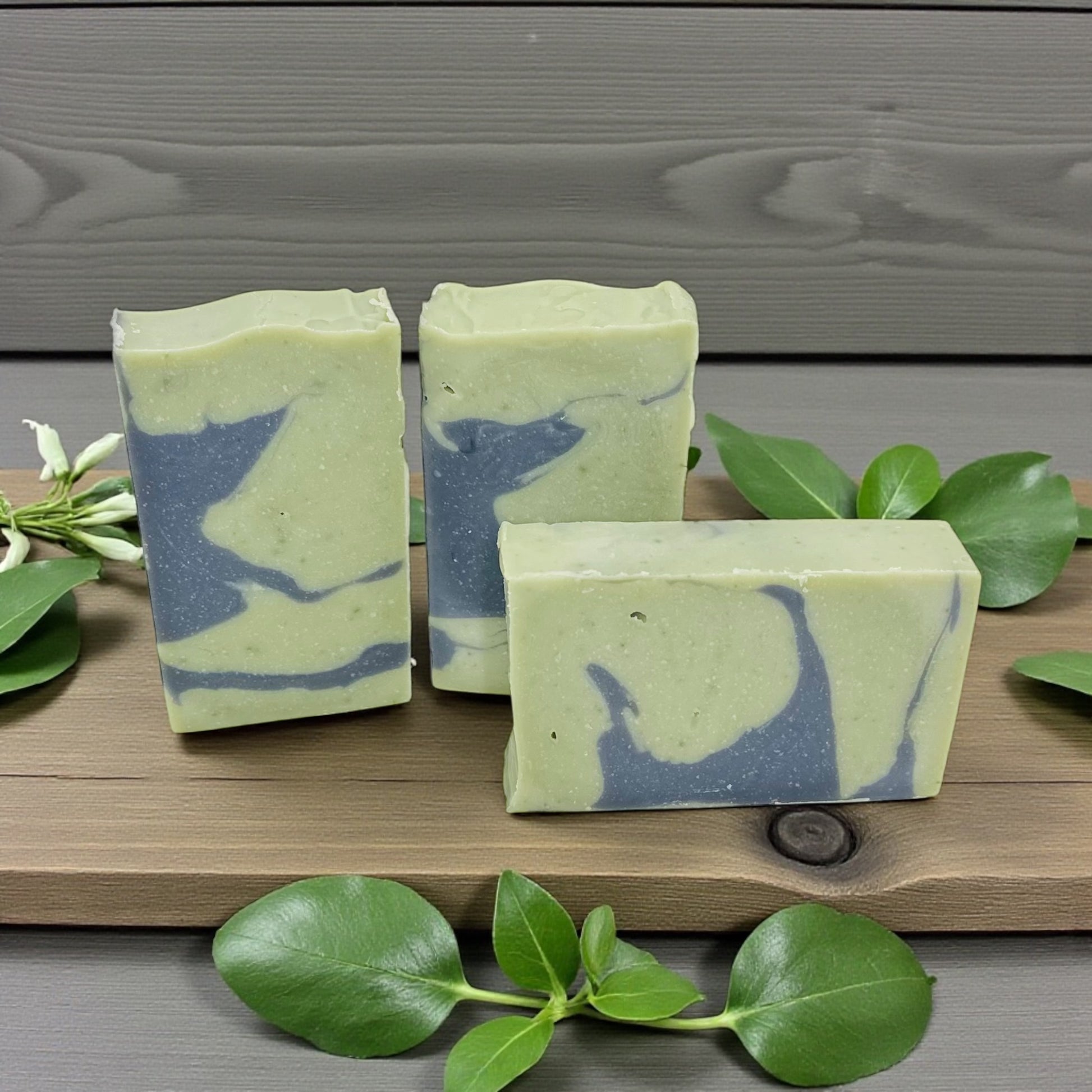 Made Coconut oil, Palm oil, Olive oil, Shea Butter, Rice Bran oil, Cocoa Butter, Vit. E., Kaolin Clay, NAOH, sodium lactate, colorant, essential oils and fragrances.