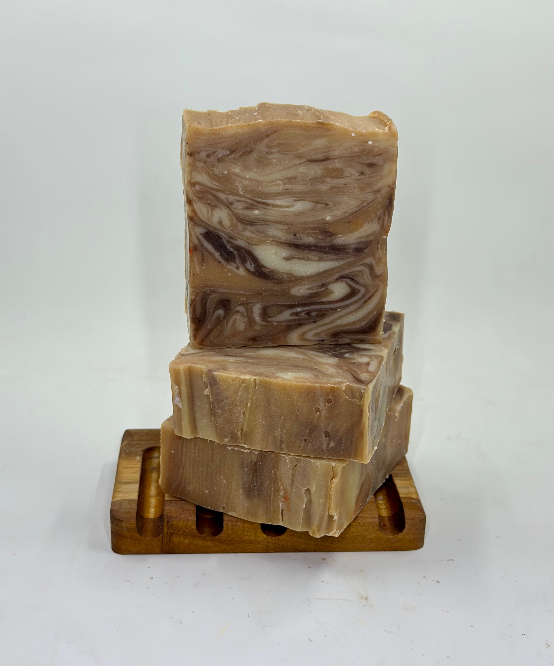 Made Coconut oil, Palm oil, Olive oil, Shea Butter, Rice Bran oil, Cocoa Butter, Vit. E., Kaolin Clay, NAOH, sodium lactate, colorant, essential oils and fragrances.