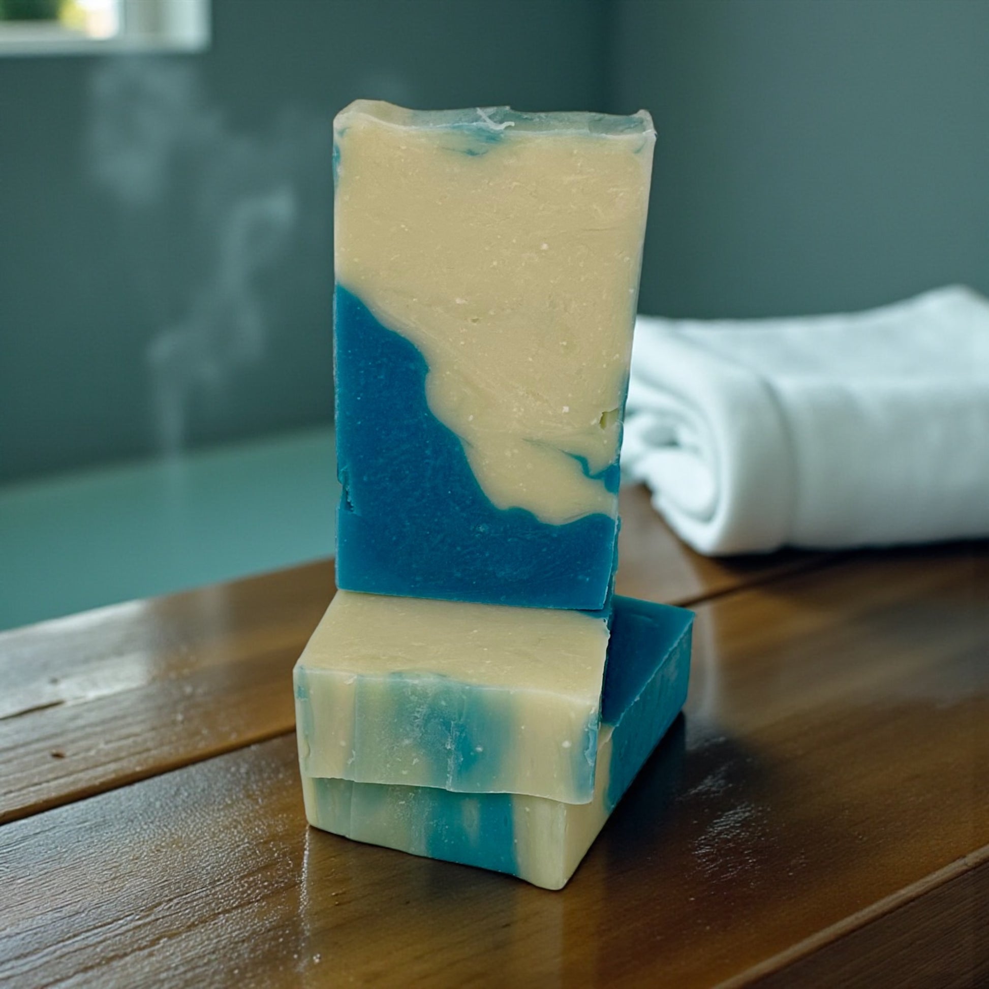 Made Coconut oil, Palm oil, Olive oil, Shea Butter, Rice Bran oil, Cocoa Butter, Vit. E., Kaolin Clay, NAOH, sodium lactate, colorant, essential oils and fragrances.