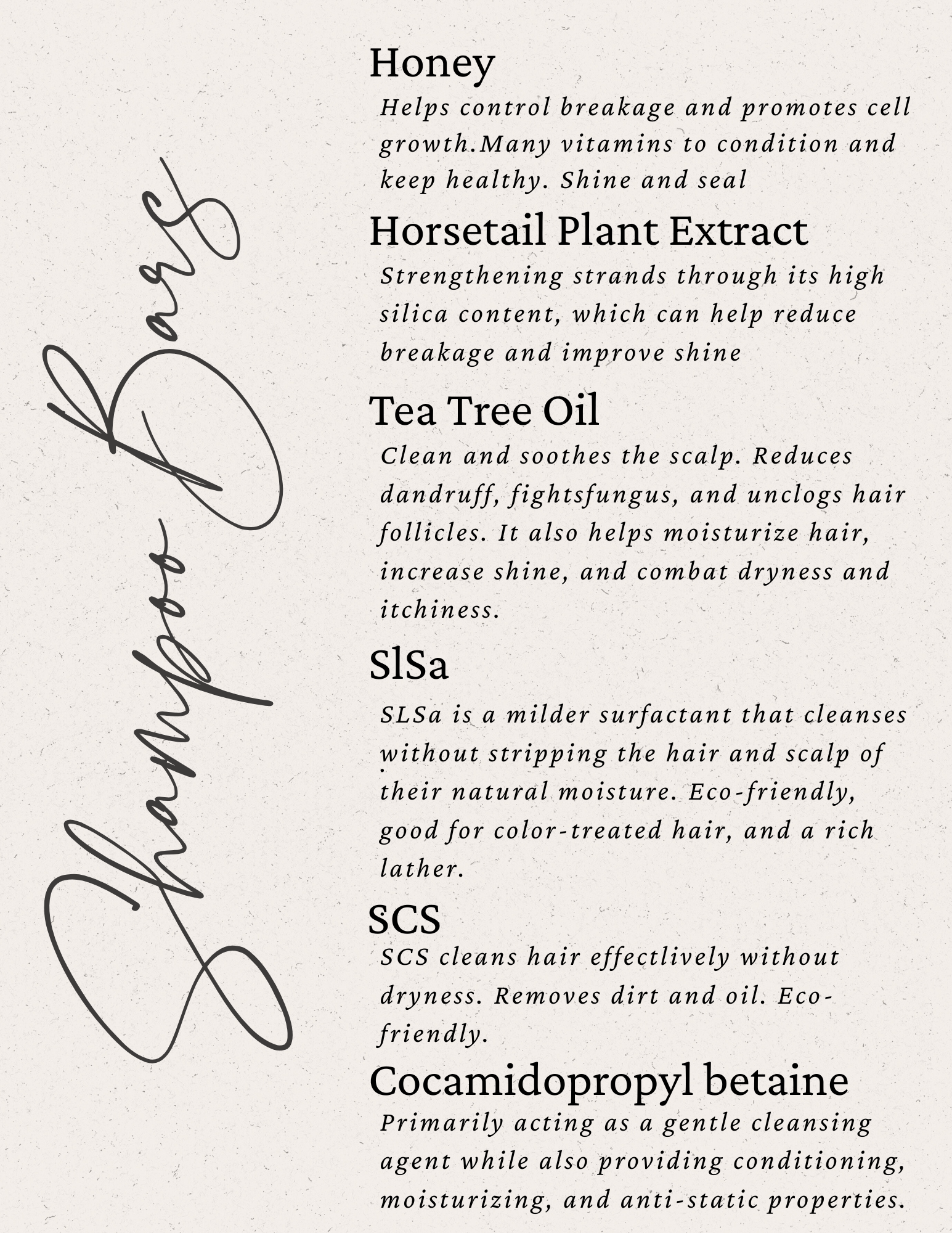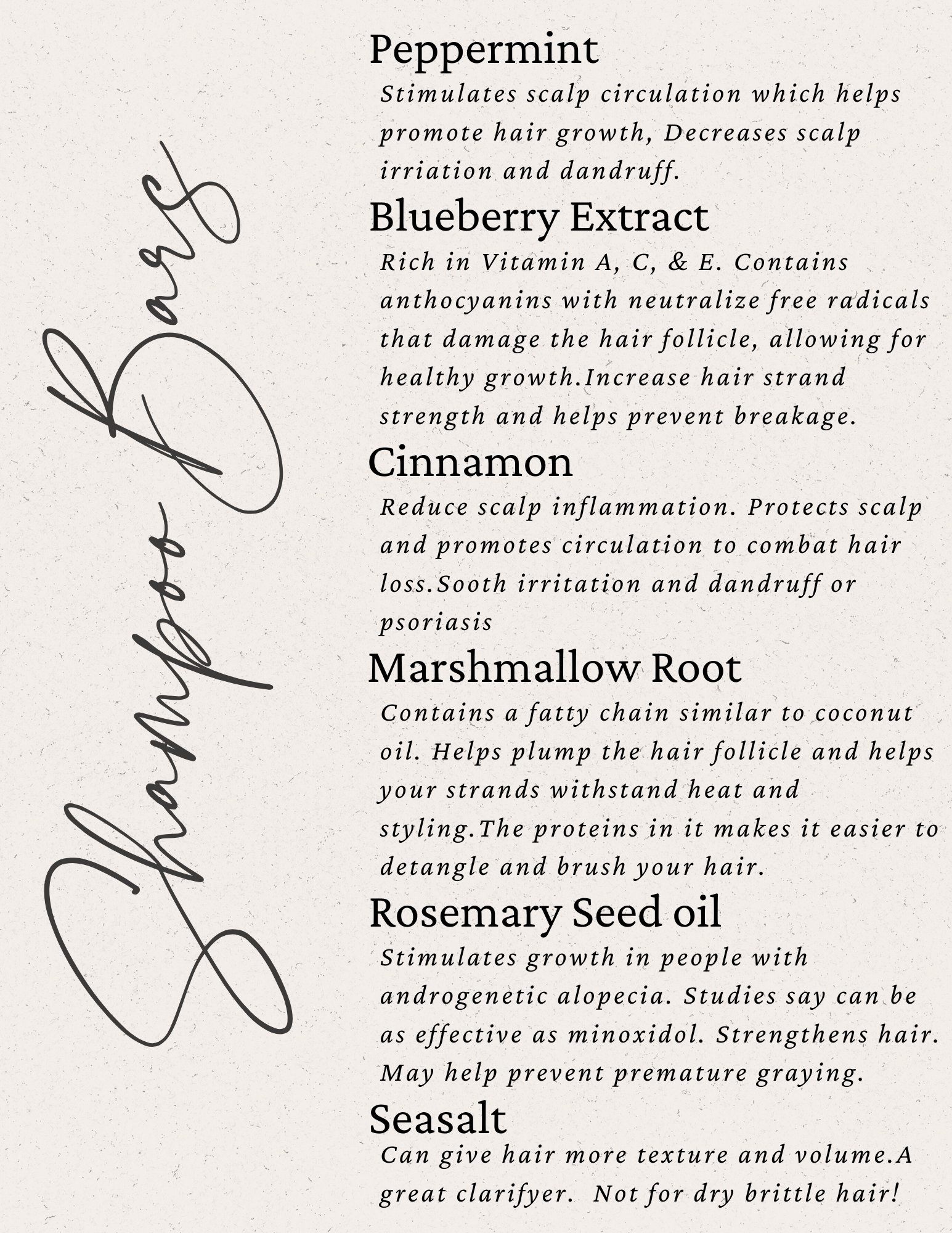 New added to shampoo bars- marshmellow root powder (natural emollient, detangler, adds volume and bounce, conditions, and reduced split ends).