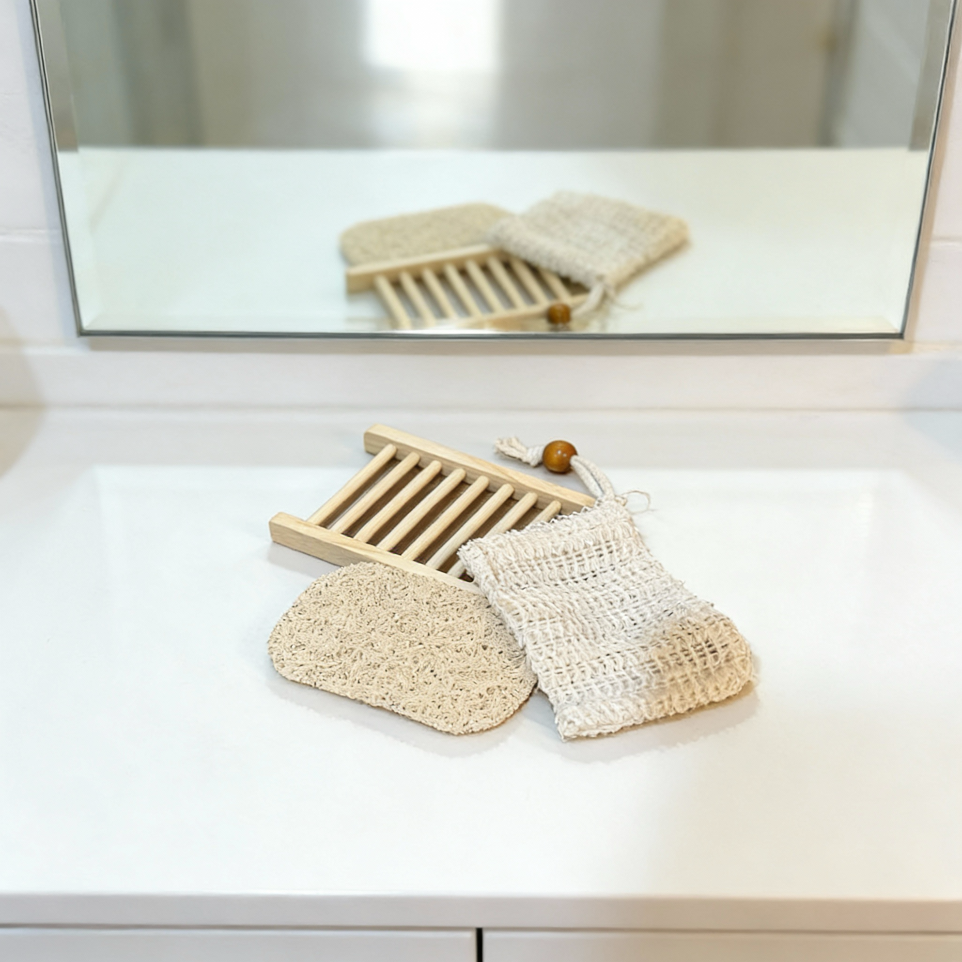 Want to get someone a gift, stocking stuffer, birthday, or just because. This set includes a soap bar sponge pad (for drainage, a wooden soap tray, and a soap saver sack to place soap in (great exfoliate). A cute minimalist, neutral colored set to add charm to any bathroom. This set goes well with one of our natural homemade body soaps.