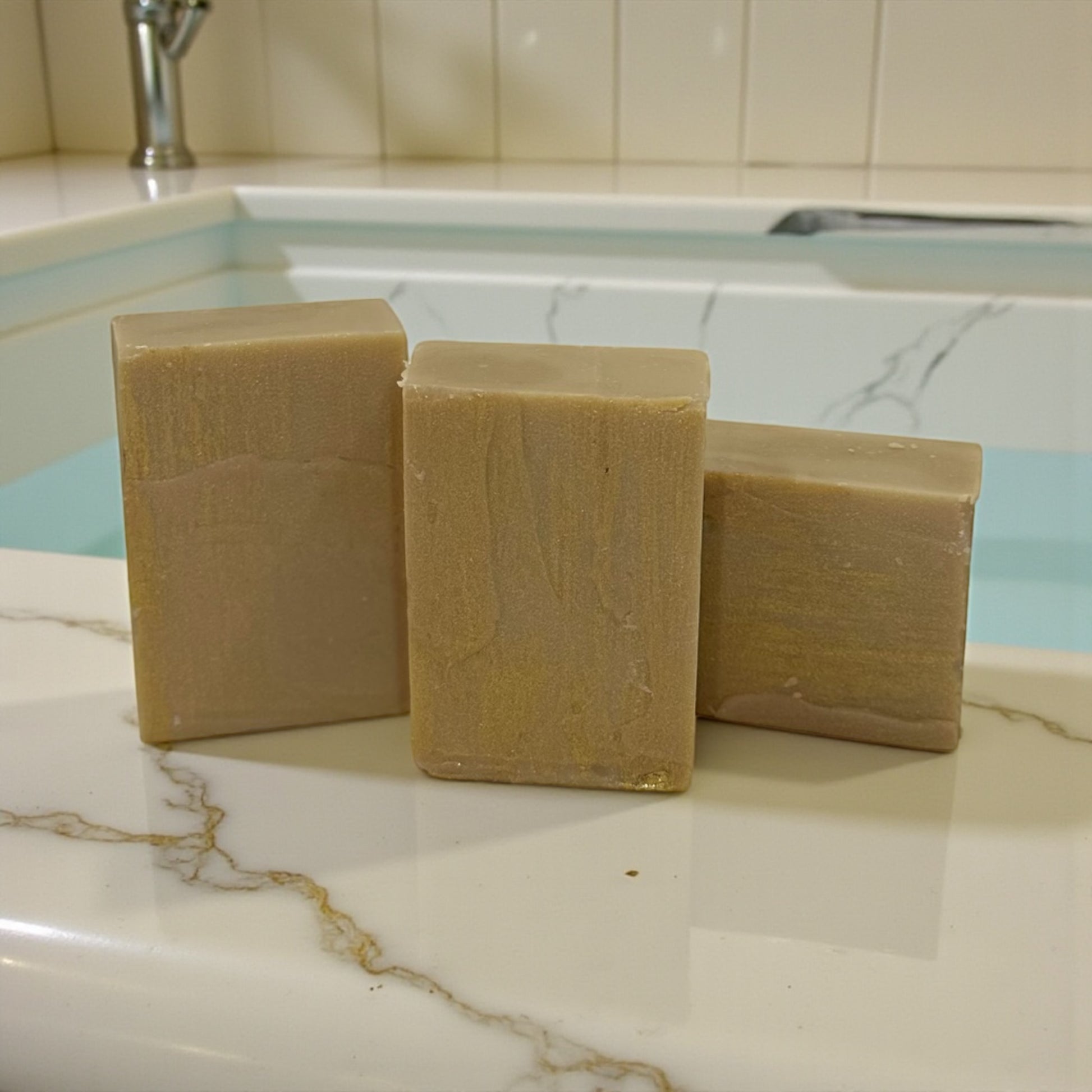 Made Coconut oil, Palm oil, Olive oil, Shea Butter, Rice Bran oil, Cocoa Butter, Vit. E., Kaolin Clay, NAOH, sodium lactate, colorant, essential oils and fragrances.